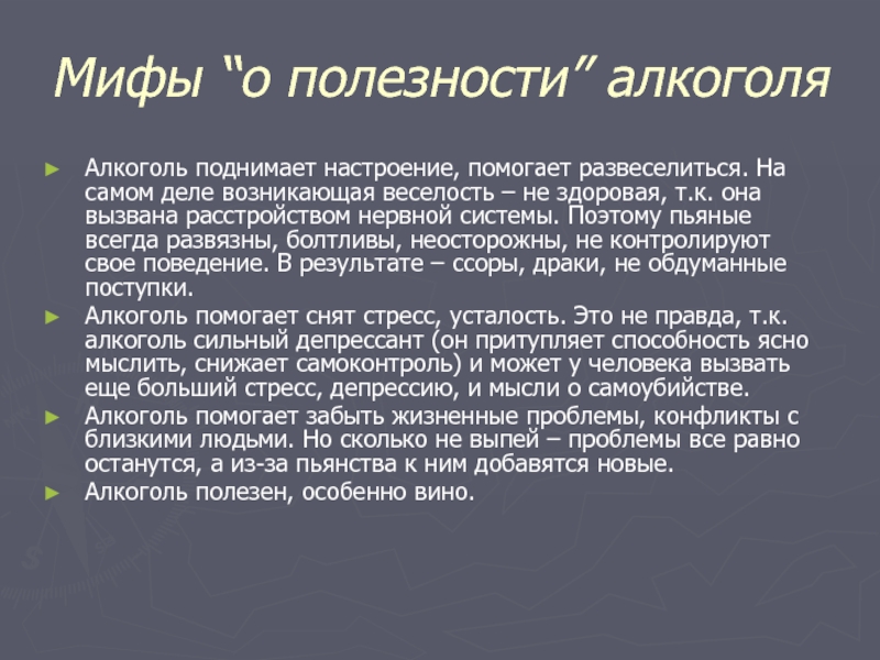Алкоголь помогает снят стресс, усталость. Это не правда, т.к. алкоголь сильный депрессант (он притупляет способность ясно мыслить, снижает самоконтроль) и может у человека вызвать еще больший стресс, депрессию, и мысли о самоубийстве.