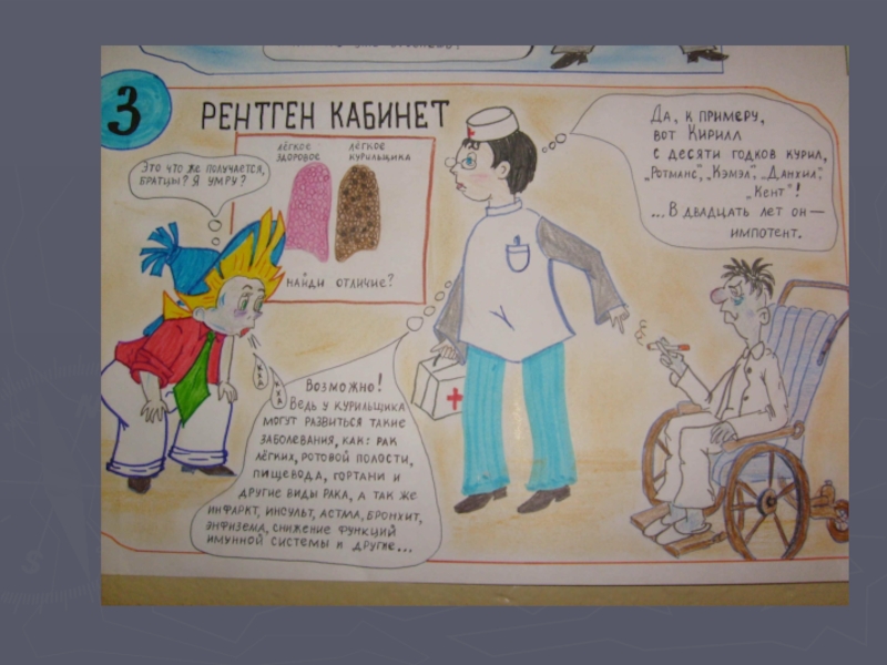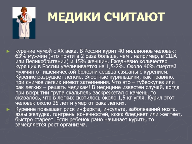 курит 40 миллионов человек: 63% мужчин (что почти в 2 раза больше, чем , например, в США или Великобритании) и 15% женщин. Ежедневно количество курящих в России увеличивается на 1,5-2%. Около 40% смертей мужчин от ишемической болезни сердца связаны с курением. Курение разрушает легкие. Злостные курильщики, как правило, при снимке легких имеют затемнения. Что это – туберкулез или рак легких – решать медикам! В медицине известен случай, когда при вскрытии трупа скальпель заскрежетал о камень, то оказалось, что в легких скопилось около 1,5 кг угля. Курил этот человек около 25 лет и умер от рака легких.