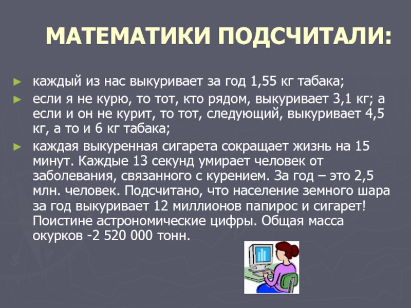 каждая выкуренная сигарета сокращает жизнь на 15 минут. Каждые 13 секунд умирает человек от заболевания, связанного с курением. За год – это 2,5 млн. человек. Подсчитано, что население земного шара за год выкуривает 12 миллионов папирос и сигарет! Поистине астрономические цифры. Общая масса окурков -2 520 000 тонн.