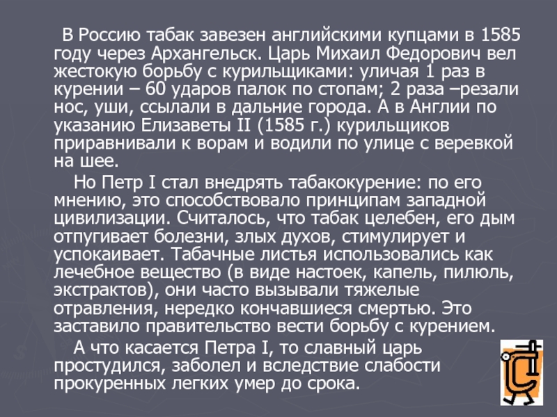 году через Архангельск. Царь Михаил Федорович вел жестокую борьбу с курильщиками: уличая 1 раз в курении – 60 ударов палок по стопам; 2 раза –резали нос, уши, ссылали в дальние города. А в Англии по указанию Елизаветы II (1585 г.) курильщиков приравнивали к ворам и водили по улице с веревкой на шее.