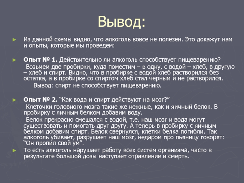 Белок прекрасно смешался с водой, т.е. наш мозг и вода могут существовать и помогать друг другу. А теперь в пробирку с яичным белком добавим спирт. Белок свернулся, клетки белка погибли. Так алкоголь убивает, разрушает наш мозг, недаром про пьяницу говорят: “Он пропил свой ум”.