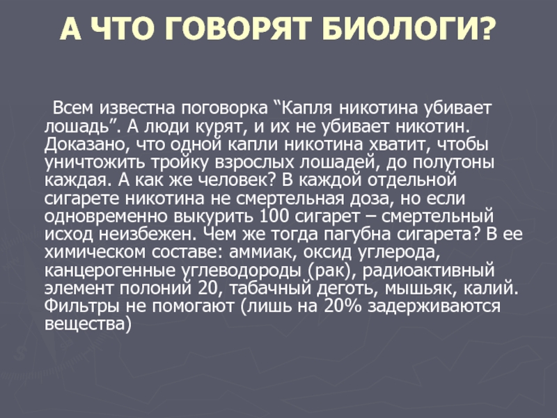 убивает лошадь”. А люди курят, и их не убивает никотин. Доказано, что одной капли никотина хватит, чтобы уничтожить тройку взрослых лошадей, до полутоны каждая. А как же человек? В каждой отдельной сигарете никотина не смертельная доза, но если одновременно выкурить 100 сигарет – смертельный исход неизбежен. Чем же тогда пагубна сигарета? В ее химическом составе: аммиак, оксид углерода, канцерогенные углеводороды (рак), радиоактивный элемент полоний 20, табачный деготь, мышьяк, калий. Фильтры не помогают (лишь на 20% задерживаются вещества)