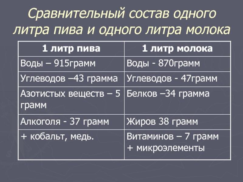 Слайд 17Сравнительный состав одного литра пива и одного литра молока