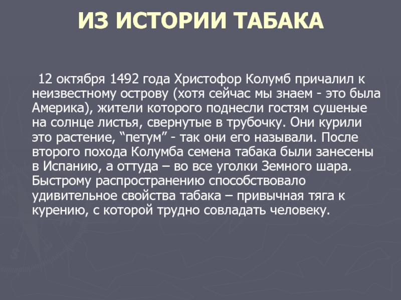 причалил к неизвестному острову (хотя сейчас мы знаем - это была Америка), жители которого поднесли гостям сушеные на солнце листья, свернутые в трубочку. Они курили это растение, “петум” - так они его называли. После второго похода Колумба семена табака были занесены в Испанию, а оттуда – во все уголки Земного шара. Быстрому распространению способствовало удивительное свойства табака – привычная тяга к курению, с которой трудно совладать человеку.