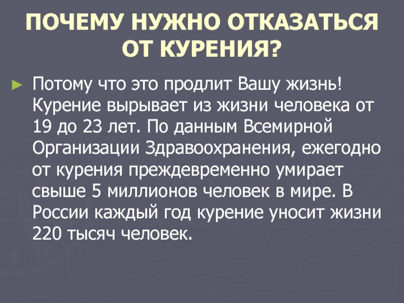 вырывает из жизни человека от 19 до 23 лет. По данным Всемирной Организации Здравоохранения, ежегодно от курения преждевременно умирает свыше 5 миллионов человек в мире. В России каждый год курение уносит жизни 220 тысяч человек.