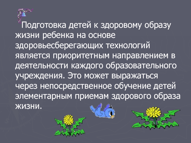 основе здоровьесберегающих технологий является приоритетным направлением в деятельности каждого образовательного учреждения. Это может выражаться через непосредственное обучение детей элементарным приемам здорового образа жизни.