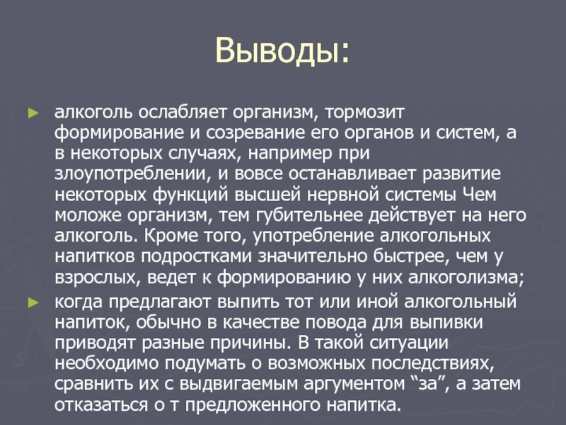 алкоголь ослабляет организм, тормозит формирование и созревание его органов и систем,