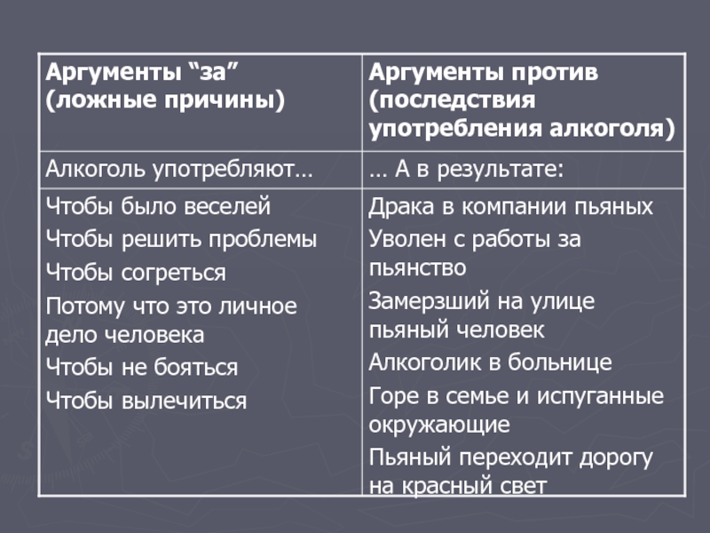 когда предлагают выпить тот или иной алкогольный напиток, обычно в качестве повода для выпивки приводят разные причины. В такой ситуации необходимо подумать о возможных последствиях, сравнить их с выдвигаемым аргументом “за”, а затем отказаться о т предложенного напитка.