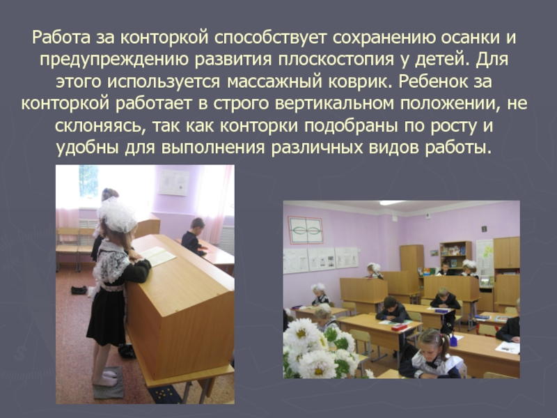 детей. Для этого используется массажный коврик. Ребенок за конторкой работает в строго вертикальном положении, не склоняясь, так как конторки подобраны по росту и удобны для выполнения различных видов работы.