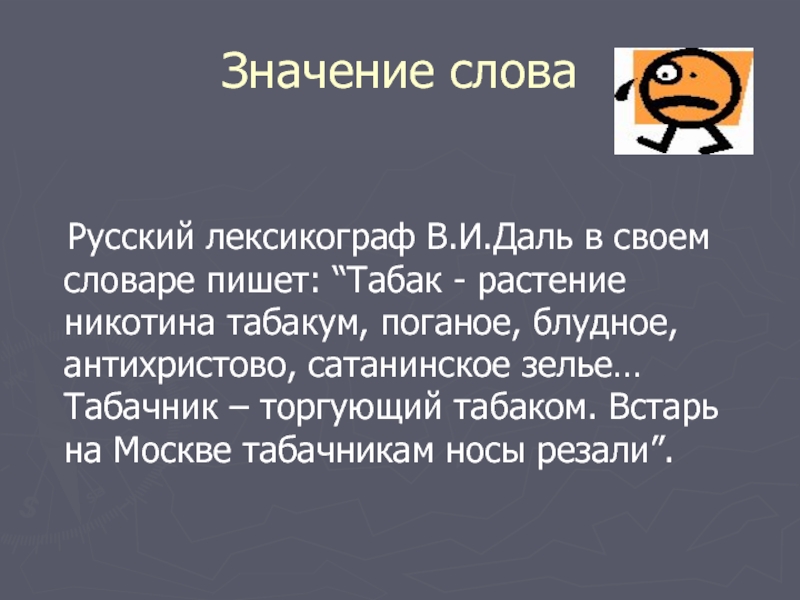 Русский лексикограф В.И.Даль в своем словаре пишет: “Табак