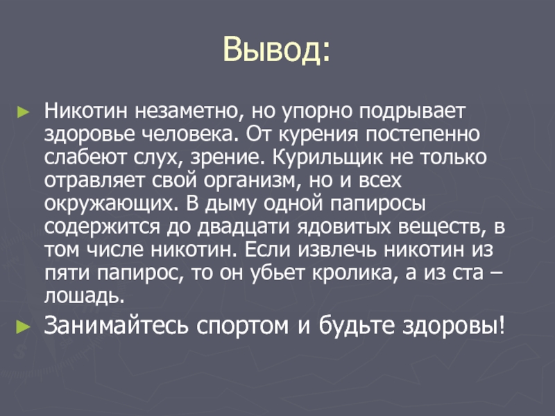 слух, зрение. Курильщик не только отравляет свой организм, но и всех окружающих. В дыму одной папиросы содержится до двадцати ядовитых веществ, в том числе никотин. Если извлечь никотин из пяти папирос, то он убьет кролика, а из ста – лошадь.