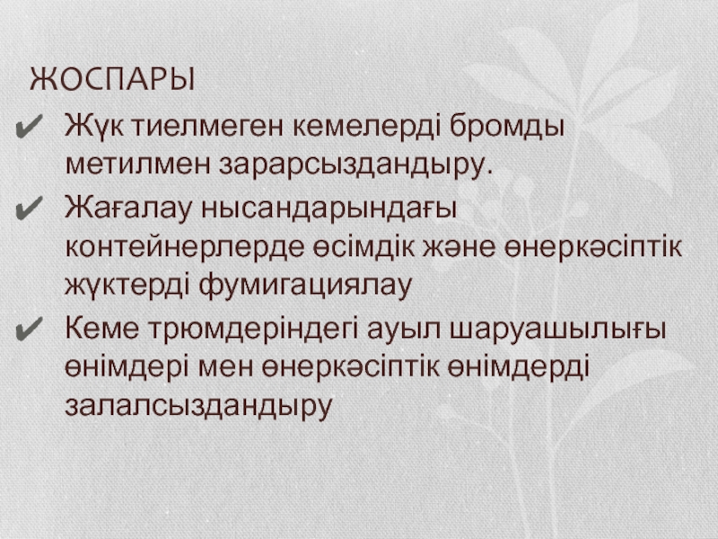 ЖАҒАЛАУ НЫСАНДАРЫНДАҒЫ КОНТЕЙНЕРЛЕРДЕ ӨСІМДІК ЖӘНЕ ӨНЕРКӘСІПТІК ЖҮКТЕРДІ ФУМИГАЦИЯЛАУ