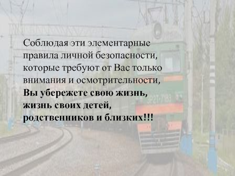 вы подвергаете опасности не только свою жизнь, но жизнь и здоровье окружающих людей, локомотивной бригады и пассажиров, едущих в поезде.