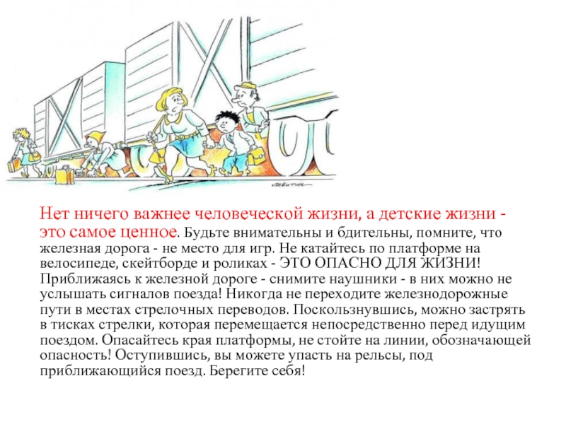 - это самое ценное. Будьте внимательны и бдительны, помните, что железная дорога - не место для игр. Не катайтесь по платформе на велосипеде, скейтборде и роликах - ЭТО ОПАСНО ДЛЯ ЖИЗНИ! Приближаясь к железной дороге - снимите наушники - в них можно не услышать сигналов поезда! Никогда не переходите железнодорожные пути в местах стрелочных переводов. Поскользнувшись, можно застрять в тисках стрелки, которая перемещается непосредственно перед идущим поездом. Опасайтесь края платформы, не стойте на линии, обозначающей опасность! Оступившись, вы можете упасть на рельсы, под приближающийся поезд. Берегите себя!