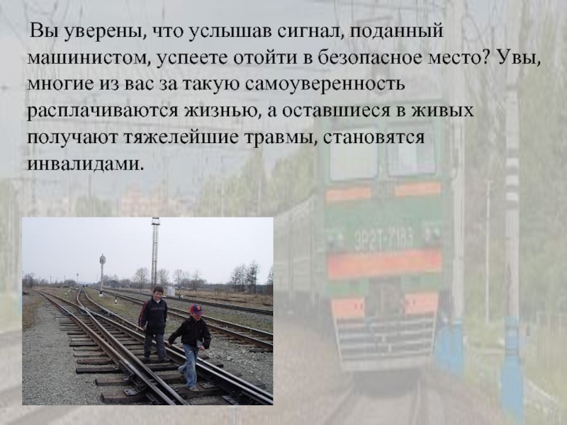 Слайд 5 Вы уверены, что услышав сигнал, поданный машинистом, успеете