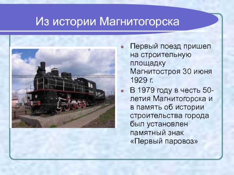 В 1979 году в честь 50-летия Магнитогорска и в память об истории строительства города был установлен памятный знак «Первый паровоз»