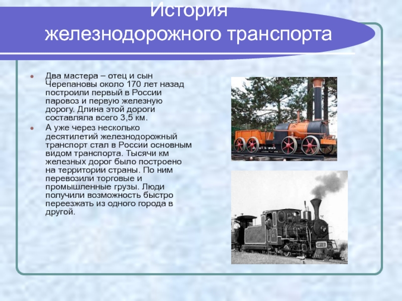лет назад построили первый в России паровоз и первую железную дорогу. Длина этой дороги составляла всего 3,5 км.