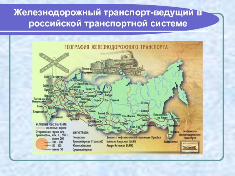 Слайд 8Железнодорожный транспорт-ведущий в российской транспортной системе
