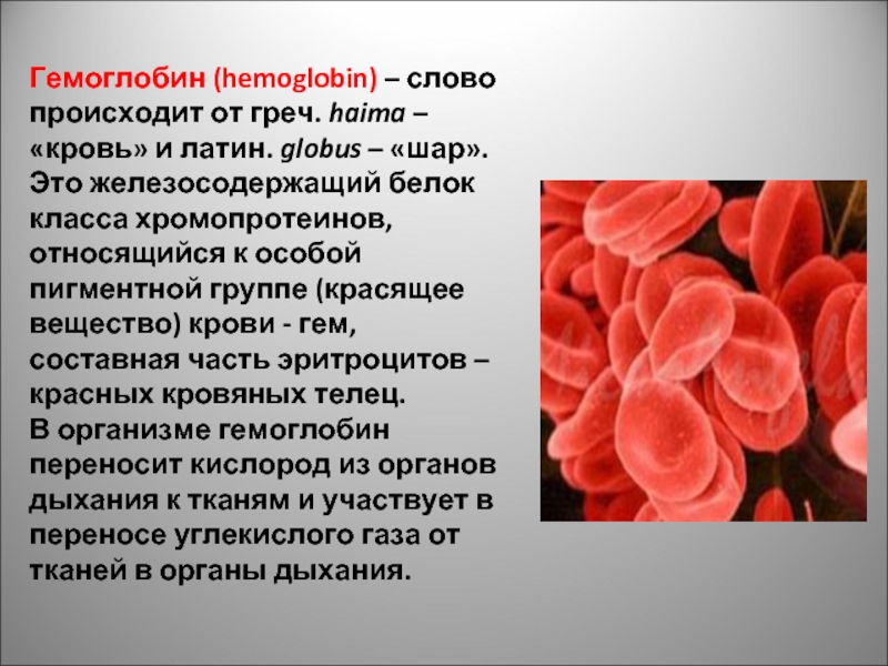 Слайд 7Гемоглобин (hemoglobin) – слово происходит от греч. haima – «кровь» и