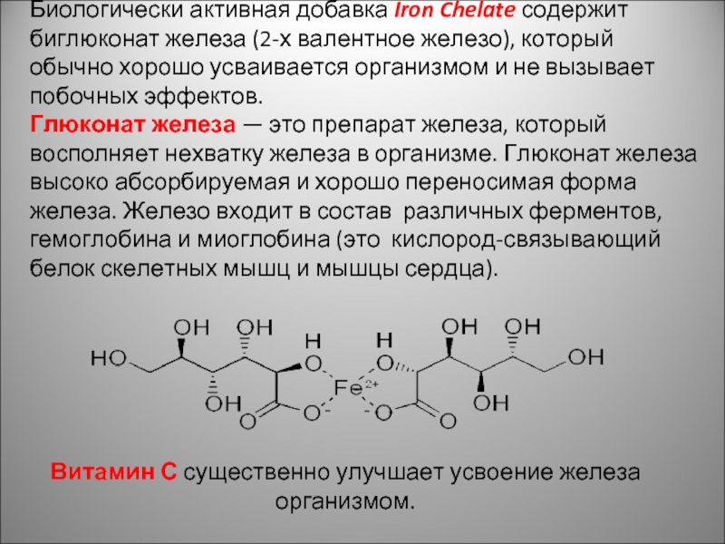 Слайд 6Биологически активная добавка Iron Chelate содержит биглюконат железа (2-х валентное железо),