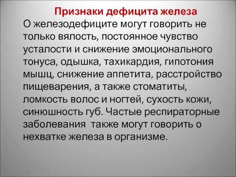 О железодефиците могут говорить не только вялость, постоянное чувство усталости и снижение эмоционального тонуса, одышка, тахикардия, гипотония мышц, снижение аппетита, расстройство пищеварения, а также стоматиты, ломкость волос и ногтей, сухость кожи, синюшность губ. Частые респираторные заболевания также могут говорить о нехватке железа в организме.