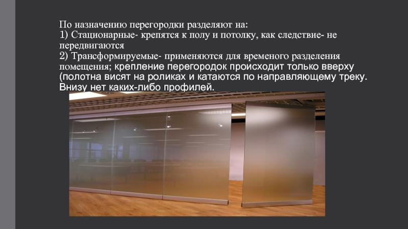 следствие- не передвигаются 2) Трансформируемые- применяются для временого разделения помещения; крепление перегородок происходит только вверху (полотна висят на роликах и катаются по направляющему треку. Внизу нет каких-либо профилей.