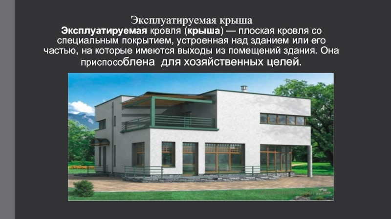Слайд 5Эксплуатируемая крыша Эксплуатируемая кровля (крыша) — плоская кровля со специальным покрытием, устроенная