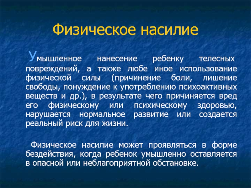 Факт - Насилие в семье не ограничивается определенными социальными группами или слоями населения. Оно может присутствовать и в семьях с высоким уровнем образования и доходов. Социально неблагополучные семьи более прозрачны, проблемы ребенка из такой семьи заметны окружающим и представителям органов власти. Семьи с высоким доходом более закрыты, и рядом с ребенком, страдающим от насилия в «социально - благополучной» семье, нет никого, кто бы мог за него заступиться. Внешнее благополучие семьи не является гарантией безопасности ребенка.