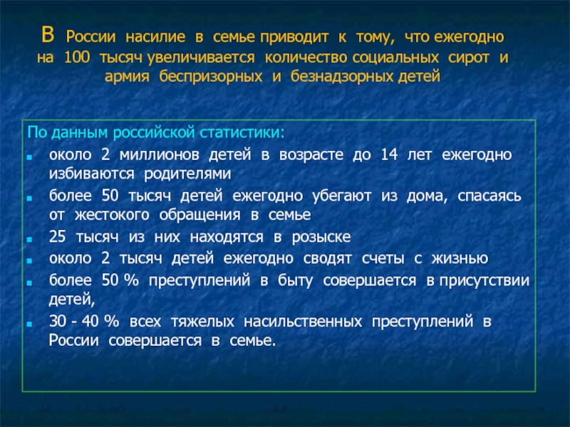30 - 40 % всех тяжелых насильственных преступлений в России совершается в семье.