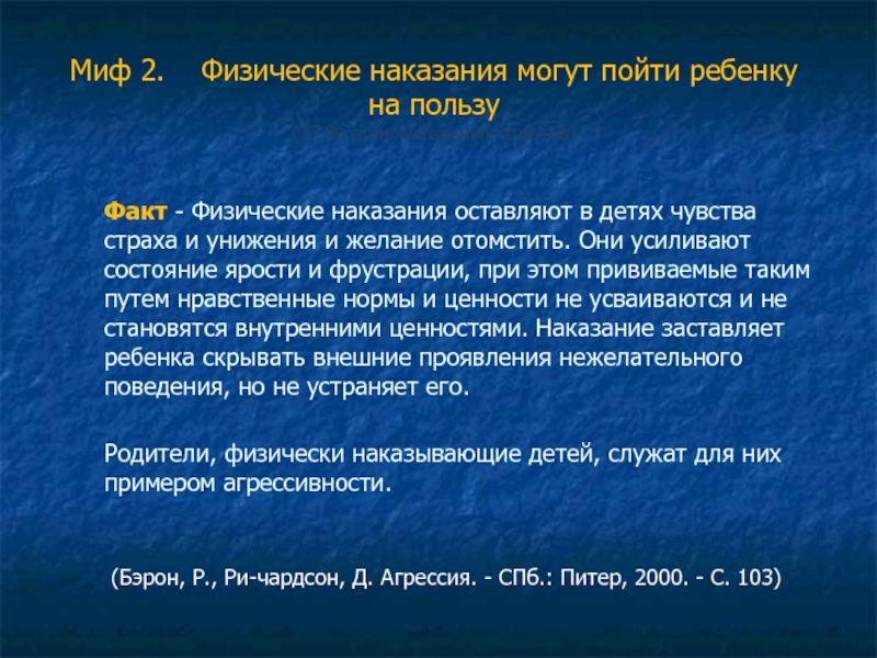 Факт - Физические наказания оставляют в детях чувства страха и унижения и желание отомстить. Они усиливают состояние ярости и фрустрации, при этом прививаемые таким путем нравственные нормы и ценности не усваиваются и не становятся внутренними ценностями. Наказание заставляет ребенка скрывать внешние проявления нежелательного поведения, но не устраняет его.
