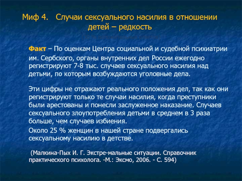 им. Сербского, органы внутренних дел России ежегодно регистрируют 7-8 тыс. случаев сексуального насилия над детьми, по которым возбуждаются уголовные дела.