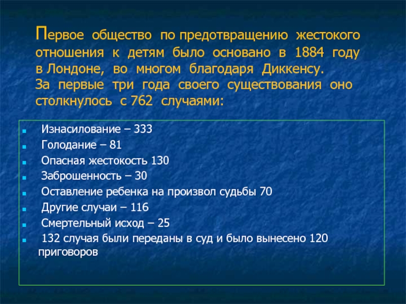 Эти цифры не отражают реального положения дел, так как они регистрируют только те случаи насилия, когда преступники были арестованы и понесли заслуженное наказание. Случаев сексуального злоупотребления детьми в среднем в 3 раза больше, чем случаев избиения.
