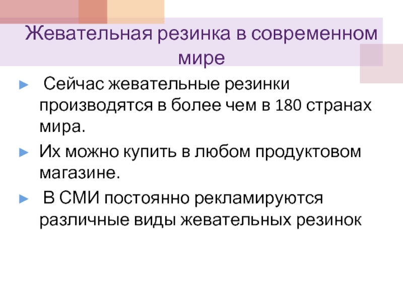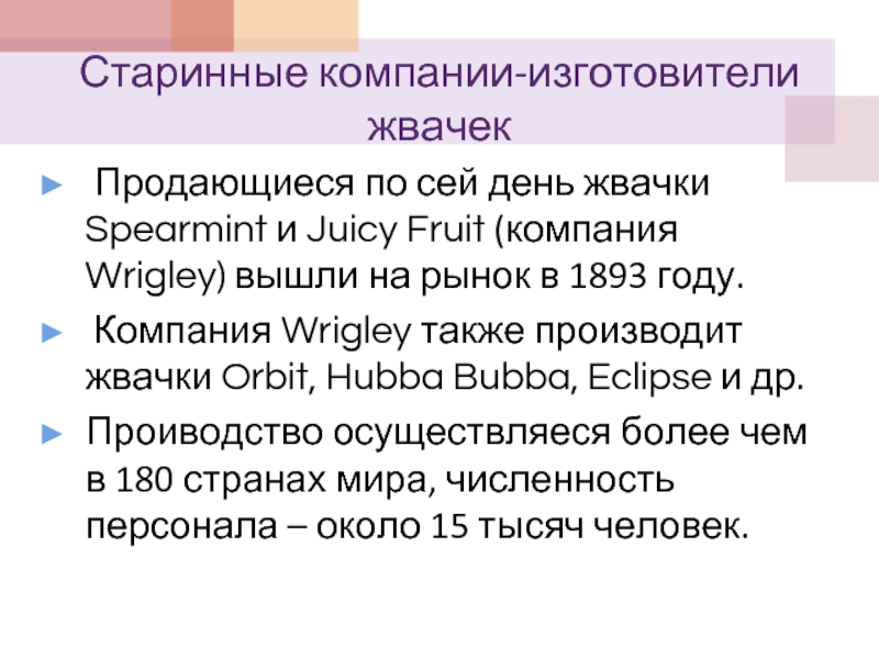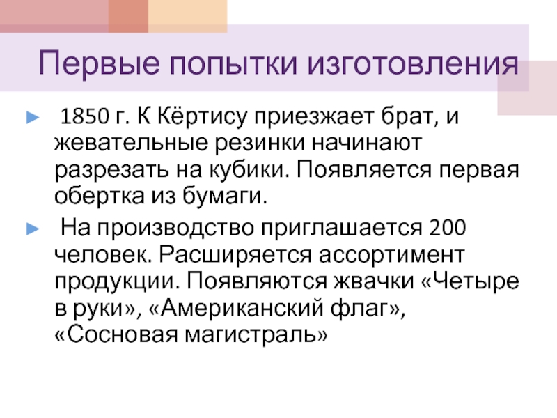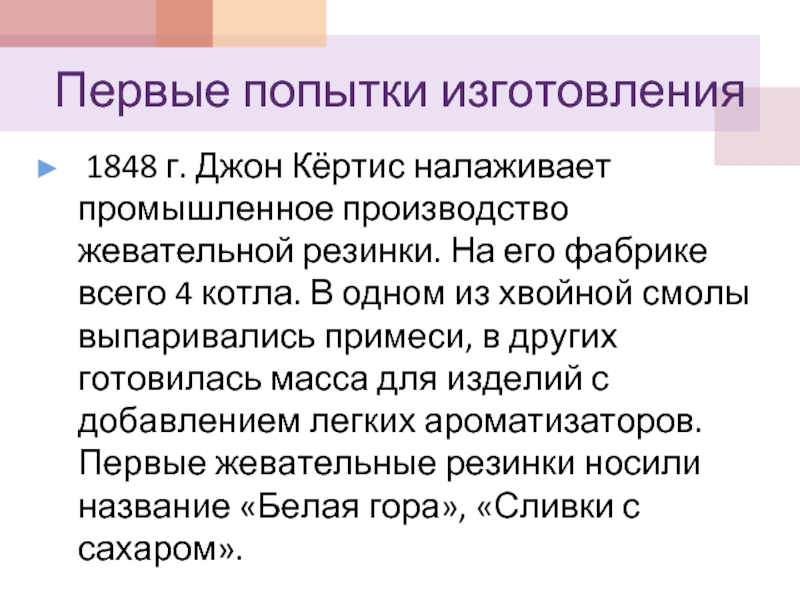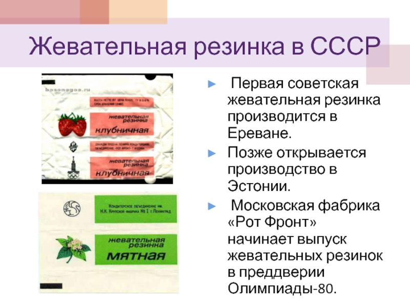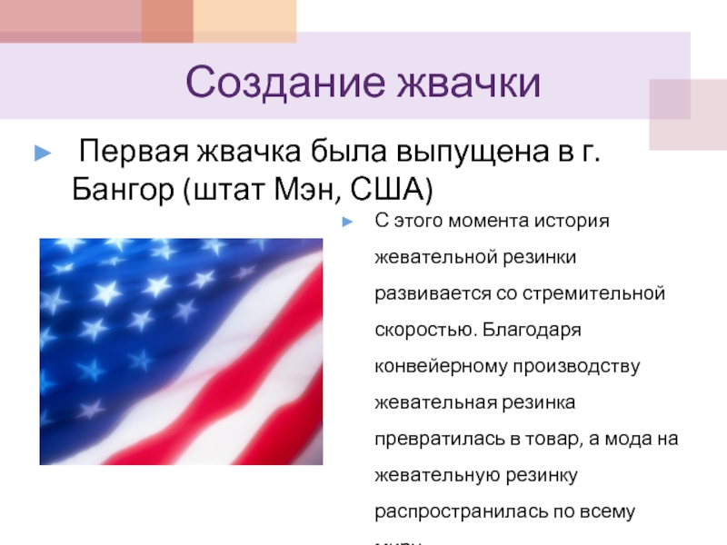 С этого момента история жевательной резинки развивается со стремительной скоростью. Благодаря конвейерному производству жевательная резинка превратилась в товар, а мода на жевательную резинку распространилась по всему миру.