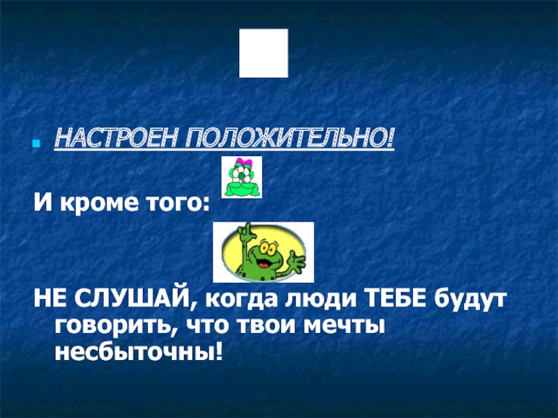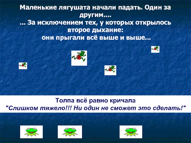 В конце концов все сдались. За исключением того одного лягушонка, который приложив все усилия, забрался на вершину!