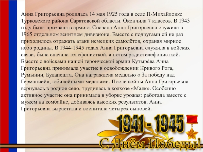 Слайд 14Анна Григорьевна родилась 14 мая 1925 года в селе П-Михайловке Турковского