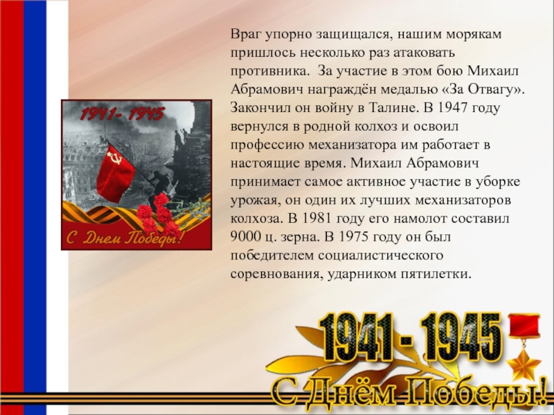 участие в этом бою Михаил Абрамович награждён медалью «За Отвагу». Закончил он войну в Талине. В 1947 году вернулся в родной колхоз и освоил профессию механизатора им работает в настоящие время. Михаил Абрамович принимает самое активное участие в уборке урожая, он один их лучших механизаторов колхоза. В 1981 году его намолот составил 9000 ц. зерна. В 1975 году он был победителем социалистического соревнования, ударником пятилетки.