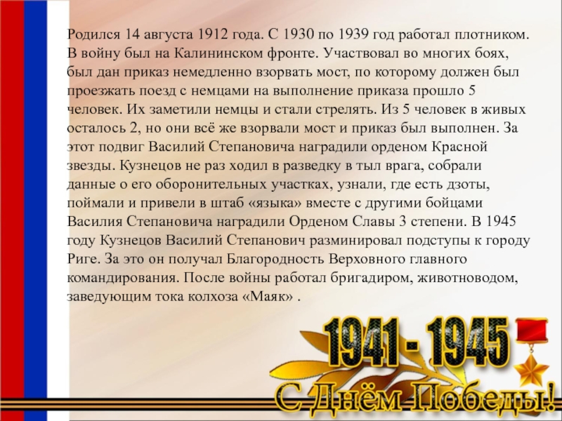 плотником. В войну был на Калининском фронте. Участвовал во многих боях, был дан приказ немедленно взорвать мост, по которому должен был проезжать поезд с немцами на выполнение приказа прошло 5 человек. Их заметили немцы и стали стрелять. Из 5 человек в живых осталось 2, но они всё же взорвали мост и приказ был выполнен. За этот подвиг Василий Степановича наградили орденом Красной звезды. Кузнецов не раз ходил в разведку в тыл врага, собрали данные о его оборонительных участках, узнали, где есть дзоты, поймали и привели в штаб «языка» вместе с другими бойцами Василия Степановича наградили Орденом Славы 3 степени. В 1945 году Кузнецов Василий Степанович разминировал подступы к городу Риге. За это он получал Благородность Верховного главного командирования. После войны работал бригадиром, животноводом, заведующим тока колхоза «Маяк» .