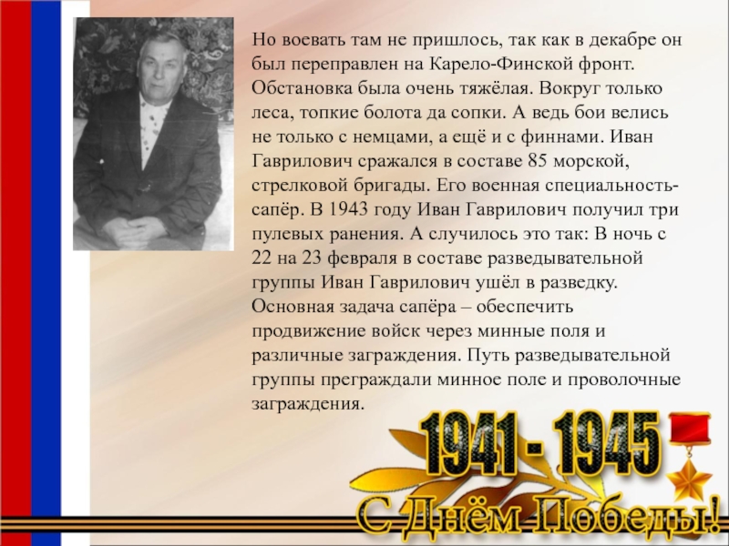 переправлен на Карело-Финской фронт. Обстановка была очень тяжёлая. Вокруг только леса, топкие болота да сопки. А ведь бои велись не только с немцами, а ещё и с финнами. Иван Гаврилович сражался в составе 85 морской, стрелковой бригады. Его военная специальность- сапёр. В 1943 году Иван Гаврилович получил три пулевых ранения. А случилось это так: В ночь с 22 на 23 февраля в составе разведывательной группы Иван Гаврилович ушёл в разведку. Основная задача сапёра – обеспечить продвижение войск через минные поля и различные заграждения. Путь разведывательной группы преграждали минное поле и проволочные заграждения.