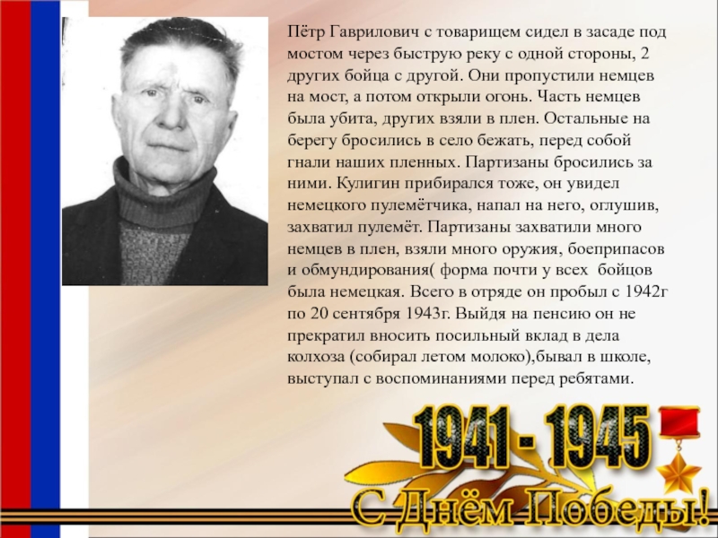 района Саратовской области.. Окончил 3 класса в 1924 году. До войны работал комбайнёром. Во время войны ушёл на фронт. В 26-м пограничном отряде. Попали в окружение в начале войны (осень 41г.). Скрывался от немцев на одном из хуторов (пос. Юдино, Попарского р-на). Как только узнал о партизанах, сразу ушёл к ним, в отряд имени Чапаева. Всего в отряде было около 500 человек. Командир- Кошелёв Василий Иванович. Отрядов действовал в Брянских лесах в Почепском и Стародубском районах. Отряд подчинялся Центральному штабу патризанского движения, имел связь с большой замлёй командир даже летал на самолёте по вызову к И.В. Сталину. Пётр Гаврилович должен был заботится о паре лошадей, на поездке находился пулемётчик с пулемётом Отряд взрывал железные дороги, мосты, совершал нападения на немецких солдат. Особенно важная операция была проведена в 1943г, летом. В ней принимали участие весь отряд. Их задача – взорвать склады в Ромахусовском лесу.
