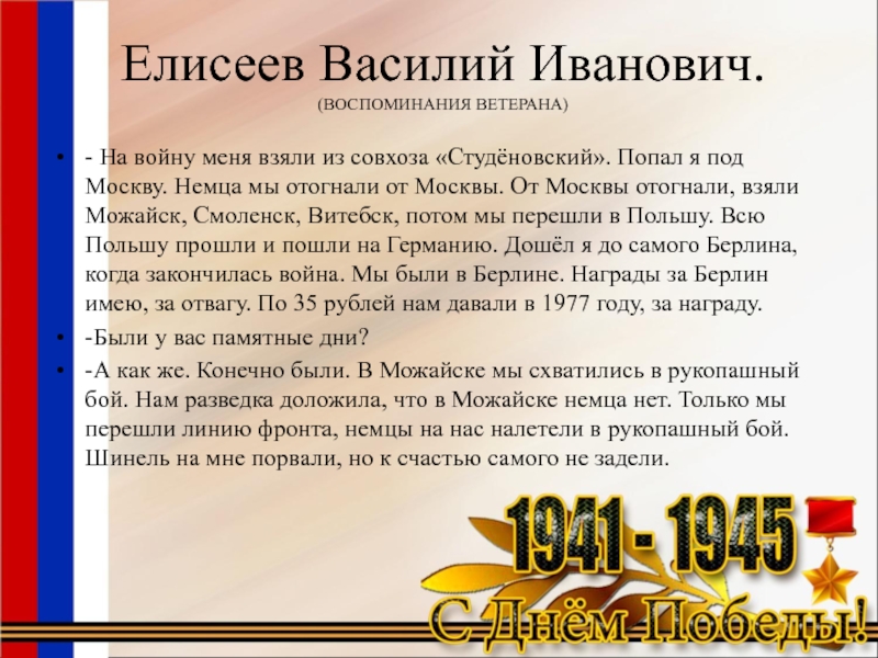 Великой Отечественной войны. Первую войну я начал с первого шага. Я в действительной год прослужил и война. Мне было тогда 22 года. В этой войне меня очень сильно ранило. У меня были перебиты нога и рука. Вот с таким ранением я попал в плен. Это когда мы были в окружении. В Великой Отечественной войне я был 2 года, потому что я ещё с той войны весь израненный. Всего я был на войне 9 лет. Запоминающийся бой у нас был в Польше. Он продолжался 28 суток. Город Августов мы защищали. Боёв у нас было очень много, все даже не упомнишь, в разведку ходили много. Однажды ночью мы ходили на разведку добровольцами заграждения проволочные немецкие резать. Многие не вернулись с этого задания. Я служил в стрелковой части недалеко от границы с Китаем.