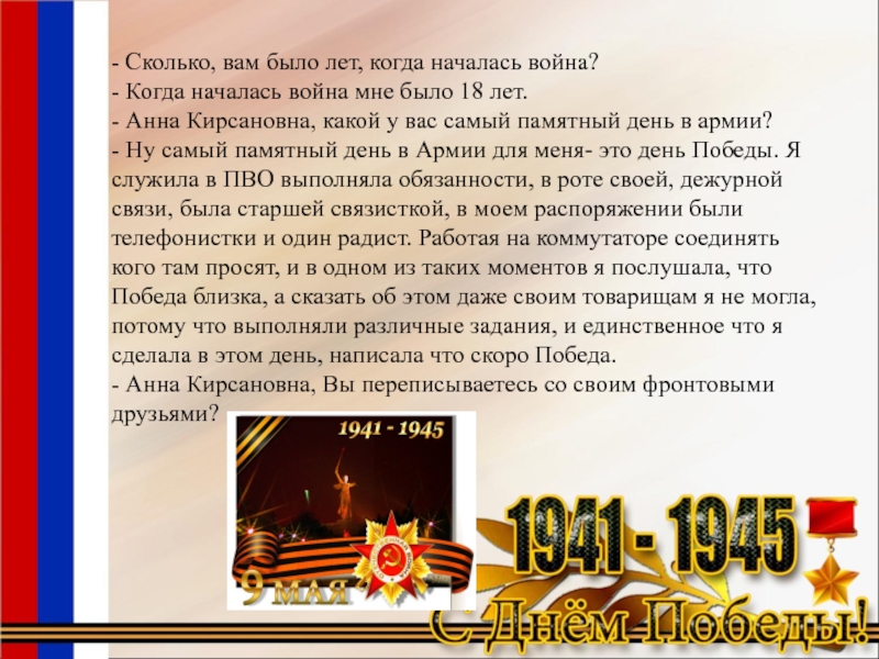 - Ну самый памятный день в Армии для меня- это день Победы. Я служила в ПВО выполняла обязанности, в роте своей, дежурной связи, была старшей связисткой, в моем распоряжении были телефонистки и один радист. Работая на коммутаторе соединять кого там просят, и в одном из таких моментов я послушала, что Победа близка, а сказать об этом даже своим товарищам я не могла, потому что выполняли различные задания, и единственное что я сделала в этом день, написала что скоро Победа.