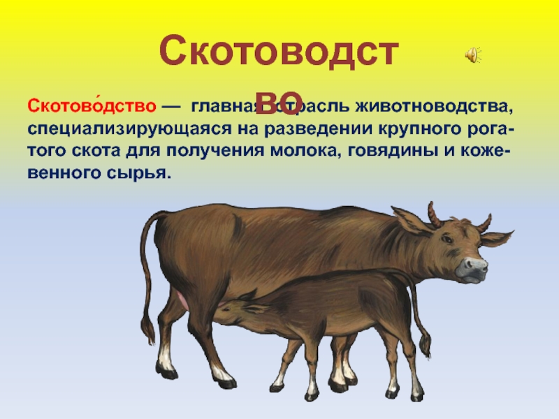 Слайд 48Скотово́дство — главная отрасль животноводства, специализирующаяся на разведении крупного рога-того скота