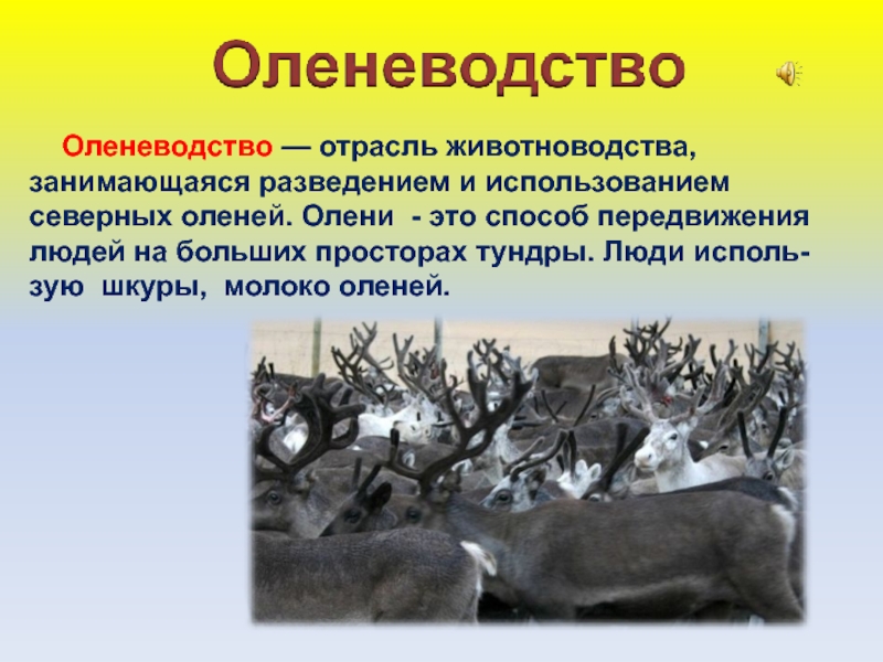оленей. Олени - это способ передвижения людей на больших просторах тундры. Люди исполь-зую шкуры, молоко оленей.