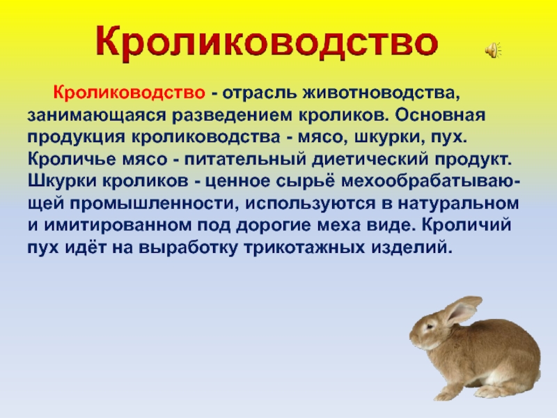 Слайд 17 Кролиководство - отрасль животноводства, занимающаяся разведением кроликов. Основная