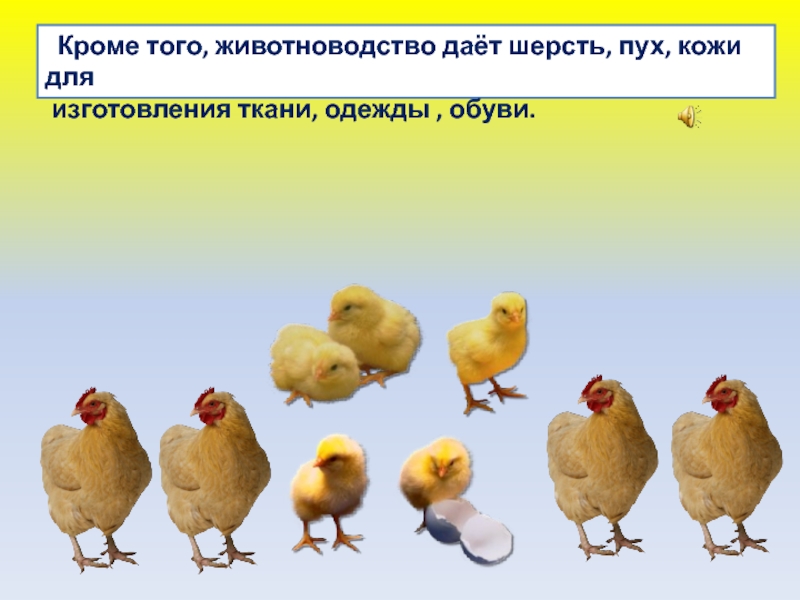 Слайд 3 Кроме того, животноводство даёт шерсть, пух, кожи для