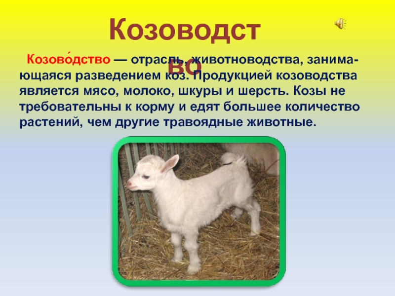 Козово́дство — отрасль, животноводства, занима-ющаяся разведением коз. Продукцией козоводства является