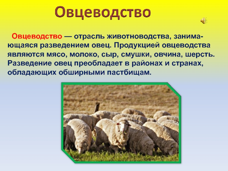 Слайд 20 Овцеводство — отрасль животноводства, занима-ющаяся разведением овец. Продукцией овцеводства являются мясо,