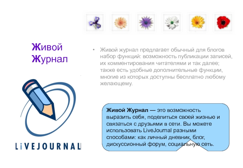 Живой Журнал — это возможность выразить себя, поделиться своей жизнью и связаться с друзьями в сети. Вы можете использовать LiveJournal разными способами: как личный дневник, блог, дискуссионный форум, социальную сеть.