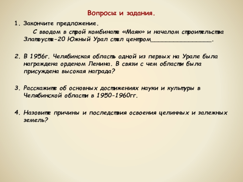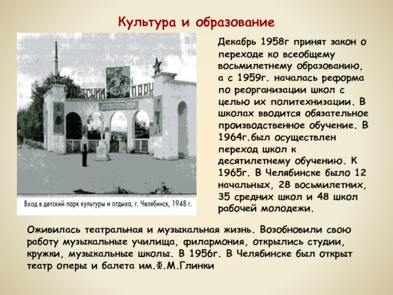 Оживилась театральная и музыкальная жизнь. Возобновили свою работу музыкальные училища, филармония, открылись студии, кружки, музыкальные школы. В 1956г. В Челябинске был открыт театр оперы и балета им.Ф.М.Глинки