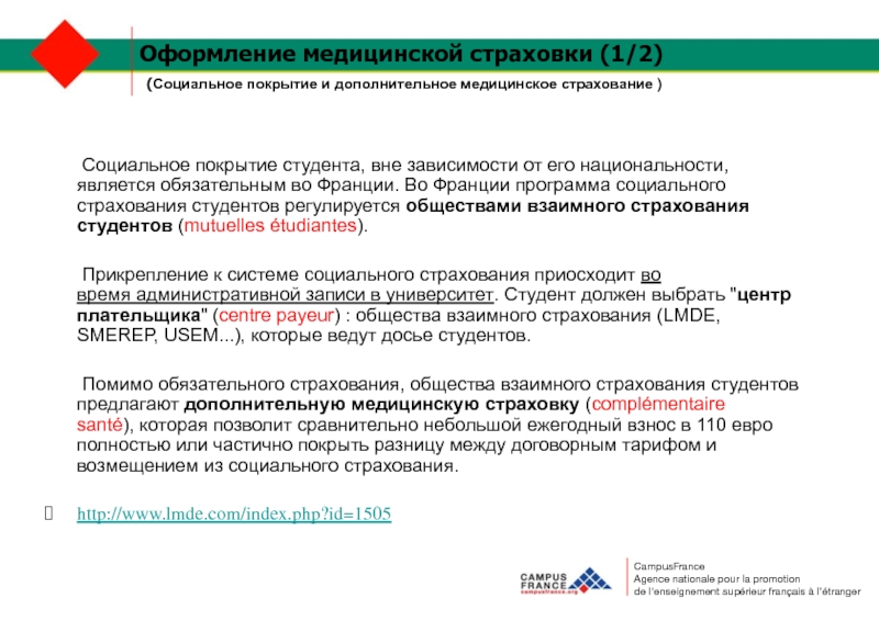 покрытие студента, вне зависимости от его национальности, является обязательным во Франции. Во Франции программа социального страхования студентов регулируется обществами взаимного страхования студентов (mutuelles étudiantes).